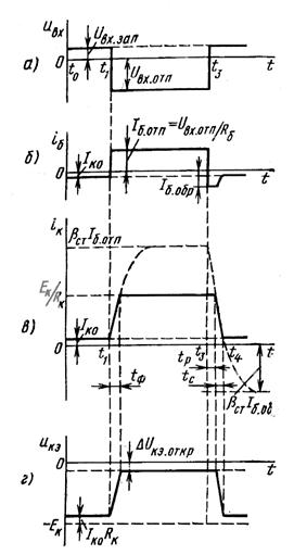 Рассмотрим процессы, происходящие в ключевой схеме (см. Рис. 69). На интервале времени t 0 – t 1 транзистор заперт. I б и I к определяются тепловым током I ко. Напряжение на транзисторе равно U кэ = - (E к - I ко R к). С момента времени t 1 начинается открытие транзистора. Характер изменения i к и u кэ отличается от входного сигнала. Это обусловлено инерционностью транзистора. Можно считать, что i к и u кэ изменяются по экспоненте. Тогда
