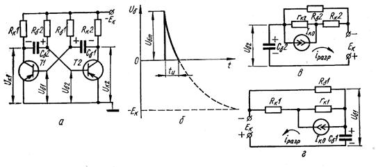 Рис. 73. Мультивибратор с коллекторно-базовыми связями: а) принципиальная схема; б) временная диаграмма разряда конденсатора; в, г) эквивалентные схемы.