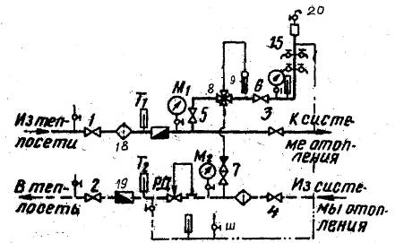 1,2, 3, 5, 7, 9, 10, 11, 12, 13, 14 – задвижки; 8 – обратный клапан; 16 – циркуляционный насос; 17 – устройство для отбора импульса давления; 18 – грязевик; 19 – водомер; 20 – воздухоотводчик; Т – термометр; М - манометр; РТ – регулятор температуры с датчиком