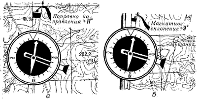 Карту ориентируют, когда не определено свое местоположение на ней или с точки стояния не видно ориентиров. При приближенном ориентировании карты вначале по компасу определяют направление на север, затем поворачивают карту так, чтобы верхняя сторона рамки была обращена в сторону севера. При точном ориентировании карты по компасу вначале указатель отсчета компаса устанавливают против деления шкалы, равного поправке направления, если компас устанавливают на вертикальной линии километровой сетки, или величине магнитного склонения, если компас устанавливают на западную или восточную сторону рамки карты (рис.1). Если поправка направления (магнитное склонение) положительная (восточное), указатель отсчета устанавливают вправо от нулевого деления шкалы, а если отрицательная (западная) - влево.