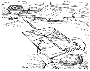 Точное ориентирование карты по направлению на удаленный местный предмет (ориентир) выполняют с помощью визирной линейки или карандаша. Линейку прикладывают на карте боковой гранью к точке стояния (отдельный камень) и условному знаку того предмета, по направлению на который ориентируют карту (железнодорожный мост). Затем поворачивают карту в горизонтальном положении так, чтобы предмет на местности оказался на линии визирования. В таком положении карта будет ориентирована точно. Определить на карте точку своего стояния легче, когда находишься на местности рядом с ориентиром (местным предметом), изображенным на карте. В этом случае расположение условного знака будет совпадать с точкой стояния.
