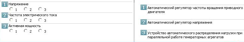 | 01.2.007 02 2М ВМ ЭМ | При инструментальном контроле технического состояния электрооборудования измеряются основные и дополнительные параметры состояния. В приведенном перечне параметров отметьте дополнительные параметры, характеризующие техническое состояние электрооборудования 1. Напряжение 2. Частота электрического тока 3. Ударные импульсы 4. Активная мощность 5. Параметры вибрации 6. Сопротивление изоляции 7. Ток нагрузки Литература: Кузнецов С.Е., Филев B.C. Основы технической эксплуатации судового электрооборудования и автоматики. Учебник-СПб.: Судостроение, 1995, с.217, 225 Комментарий: К дополнительным относят параметры, которые могут быть использованы при определении технического состояния отдельных видов электрооборудования. В приведенном перечне параметров к дополнительным относятся: параметры, характеризующие техническое состояние соответствующих регуляторов (частота электрического тока, напряжение, активная мощность) и параметры, характеризующие в основном состояние подшипников (параметры вибрации, ударные импульсы) | |