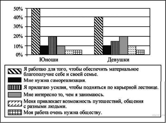 14. Задание 12 № 5517. Социологи опросили 23-летних работающих юношей и девушек страны Z. Им задавали вопрос: «Зачем Вы работаете, какова Ваша трудовая мотивация?». Полученные результаты (в % от числа опрошенных) представлены в виде диаграммы.