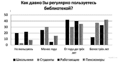 5) Доля пенсионеров, пользующихся библиотекой от года до трёх лет, меньше, чем доля пенсионеров, не пользующихся библиотекой вообще или пользующихся ей менее года.