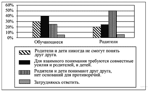 3) Среди обучающихся мнение о том, что для взаимного понимания требуются совместные усилия и родителей, и детей, более популярно, чем мнение о том, что родители и дети никогда не смогут понять друг друга.
