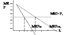 Применяя правило MRPL = MRCL, определяем спрос на труд. В условиях чистой конкуренции фирма нанимает 4 работника, ориентируясь на правило MRPL=PL(= MRCL) = 10дол. Монополия, по данным задачи, сможет нанять только 2-х работников, когда MRPL= 11> PL(=MRCL) = 11дол.