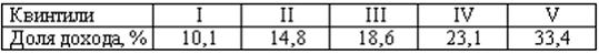 В таблице представлено распределение суммарного дохода по пяти 20-процентным группам семей (от самой бедной до самой богатой) в РФ в 1980 году.