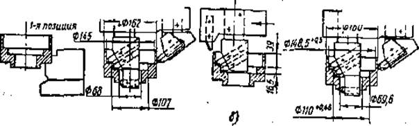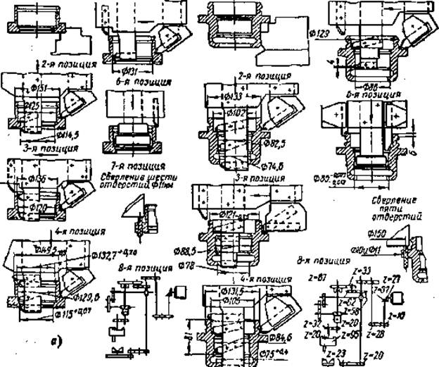 При переналадке станка со второго фланца на третий (см, рис. 7.25, в и 7.26, в) необходимо: на позициях 2, 3, 4, 5 и 6 повернуть резцедержатели на ] 20°, на позициях 2,4 и б установить величину рабочего хода и на позициях 7 и 8 отключить сверлильные головки.