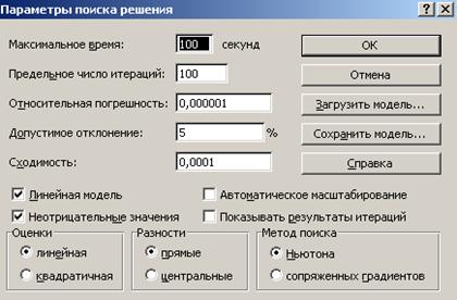 · установите флажки в окнах Линейная модель (это обеспечит применение симплекс метода) и Неотрицательные значения. Все остальное можно оставить без изменений;