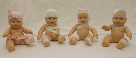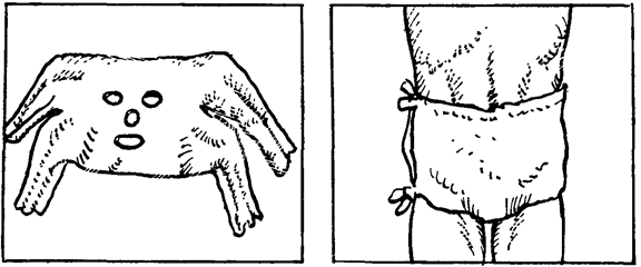 Экономичные повязки по Маштафарову. Готовят из широкого материала или широких бинтов, концы которых продольно нарезают для получения тесемок, на каждую область тела экономичную повязку готовят отдельно, в соответствие с размером поверхности, подлежащей укрытию.