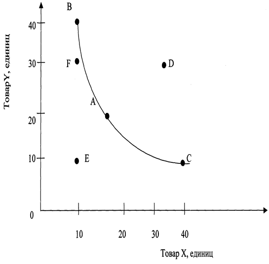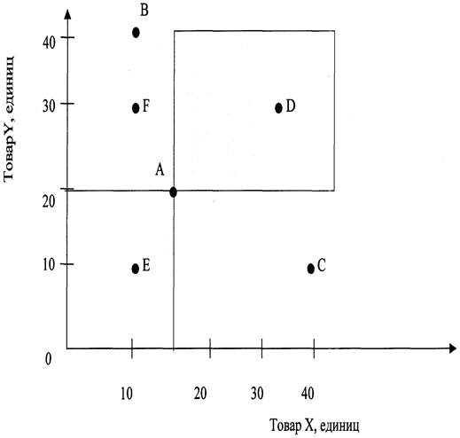Аналогичным образом можно достаточно просто сравнить набор A со всеми наборами на прямоугольных участках, включающих точки E и D. В то же время для сравнения набора A с наборами B и С и другими наборами, находящимися на прямоугольных участках, необходима более полная информация об их оценке потребителем, поскольку по сравнению с набором А набор В содержит больше единиц товара Y, но меньше единиц товара Х, а набор С содержит больше товара Х, но меньше товара Y.