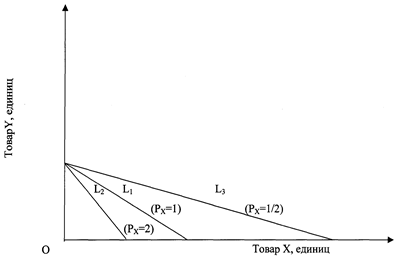 В этом случае покупательская способность человека, закупающего значительное количество товара Х, существенно снижается. В другом случае, когда цена товара Х снижается наполовину, угловой коэффициент бюджетной линии изменится с - РХ / РY до – 1/2 РХ / РY и новую бюджетную линию L3 получаем путем вращения первоначальной линии L1 против часовой стрелки, а покупательная способность человека, приобретающего значительный объем товара Х, увеличивается.