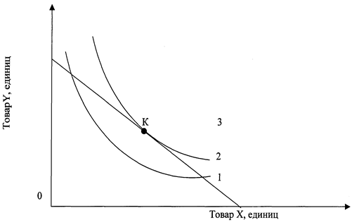 Оптимальный набор потребительских товаров и услуг должен отвечать одновременно двум требованиям: находиться на бюджетной линии и представлять для потребителя наиболее предпочтительное сочетание товаров. Это означает, что набор, который обеспечивает максимальное удовлетворение потребностей, должен соответствовать точке К – точке касания бюджетной линии с самой высокой кривой безразличия.