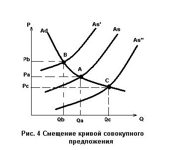 Вся совокупность факторов, воздействующих на изменение совокупного предложения, относится к неценовым и, следовательно, вызывает смещение кривой As. Это смещение указывает на изменения в издержках производства на единицу национального продукта. При этом рост издержек производства на единицу продукта вызывает смещение кривой As вправо, а их сокращение – влево.