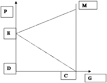 Модель рыночного сектора смешанной экономики можно получить следующим образом: начнем выводить устремляющиеся навстречу друг другу линии спроса и предложения (из точек К и О соответственно), но только до точки их пересечения (Е). Именно эта ситуация и представлена на рис.36. «Рыночным» этот сегмент (ОКЕ) графика делает то обстоятельство, что он строго соответствует главному, существенному признаку рынка, суть которого в том, что это – сфера доходного предпринимательства (индивидуального или корпоративного).