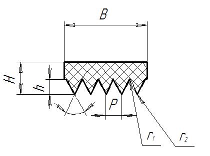 | Примечания 1. L – расчётная длина ремня на уровне нейтральной линии. 2. r, r1 – радиусы закруглений сечений поликлиновых ремней: К(0,2; 0,4), Л(0,4; 0,6); М(0,8; 1,0). 3. Z – рекомендуемое число клиньев сечений поликлиновых ремней: К – 2…36, Л – 4…20, М – 2…20. |