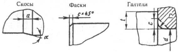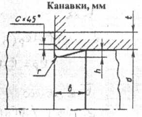 Для облегчения монтажа предусматривают скосы размером а (таблица 4.4). Для плотного прилегания торцов деталей к буртикам вала делают галтели радиусом r в зависимости от диаметра d(размеры в мм) или канавки (таблица 4.5). В местах перехода от одного диаметра dк другому D, если детали не устанавливают, предусматривают галтели с радиусом закругления R≈0,4(D-d).