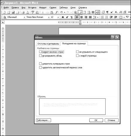 Каждая страница (кроме последней страницы раздела) должна быть заполнена текстом полностью. Однако иногда программа автоматически переносит последний абзац на следующую страницу. Для того, чтобы избежать этого, следует в пункте меню «Формат», подпункте «Абзац» убрать выделения («галочки») с пунктов «Запрет висячих строк», «Не разрывать абзац», «Не отрывать от следующего» и «С новой страницы» на вкладке «Положение на странице» (рисунок 2).