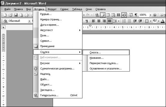 Ссылка на страницу может быть оформлена и как сноска, располагающаяся внизу страницы: пункт меню «Вставка», подпункт «Ссылка», подпункт «Сноска» (рисунок 4).