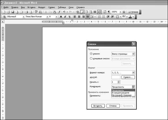 Параметры сносок можно установить так, чтобы нумерация начиналась на каждой странице либо продолжалась с начала и до конца работы (рисунок 5).