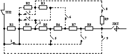 … контактор тормозного переключателя ТП 2→ контактор реостатного контроллера 1→ пуско-тормозные резисторы R4-R5-Rб-R7-R8→ линейно-тормозной контактор ЛКТ… параллельно сопротивлению R4… пуско-тормозные