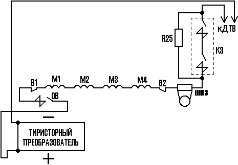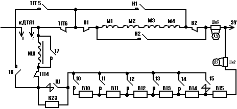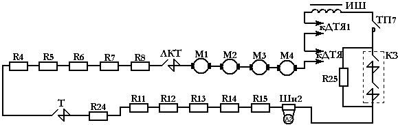 первая катушка дифференциального реле ДР → линейный контактор ЛК→ контактор тормозного переключателя ТП 2 → пуско-тормозные резисторы R1-R4-R5-R6-R7-R8 → линейно-тормозной контактор ЛКТ →обмотки якорей тяговых двигателей М1-М2-М3-М4→ датчик тока якоря ДТЯ→ датчик тока якоря один ДТЯ-1→контактор тормозного переключателя ТП-6→ контактор реверсора В1→ обмотки возбуждения тяговых двигателей М1-М2-М3-М4→ контактор реверсора В2→шунт амперметра три Шн3→ вторая катушка дифференциального реле ДР→ вторая первичная обмотка дифференцирующего трансформатора ТрД→ шунт амперметра один Шн1→ шунт счётчика два Шн5→ шунт счётчика один Шн4→ заземляющее устройство ЗУ.