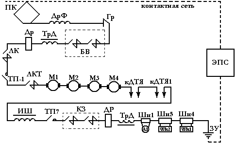 разъединитель ГР → быстродействующий выключатель БВ → первая первичная обмотка дифференцирующего трансформатора трд → первый виток дифференциального реле ДР → линейный контактор ЛК → контактор тормозного переключателя ТП-2 → контактор реостатного контроллера 9 → линейно-тормозной контактор ЛКТ → обмотки якорей тяговых двигателей М1-М2-М3-М4 → датчик тока якоря ДТЯ → датчик тока якоря один ДТЯ-1 → контактор тормозного переключателя ТП-6 → контактор реверсора В-1 → обмотки возбуждения тяговых двигателей М1-М2-М3-М4 → контактор реверсора В-2 → шунт амперметра три ШН-3 → второй виток дифференциального реле ДР → вторая первичная обмотка дифференцирующего трансформатора ТрД → шунт амперметра один ШН-1 → шунт счётчика два ШН-5 → шунт счётчика один ШН-4 → заземляющее устройство ЗУ.