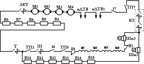 → пуско-тормозные резисторы R6-R7-R8 → линейно-тормозной контактор ЛКТ… Общее сопротивление на 6 позиции реостатного контроллера составляет 5,35 Ом.