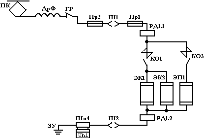 остаётся в первом положении. Все силовыекулачковые контакторы разомкнуты. Силовой ток проходит по следующей цепи; контактный провод → токоприёмник ПК→фильтр-дроссель ДРФ→ главный разъединитель ГР→