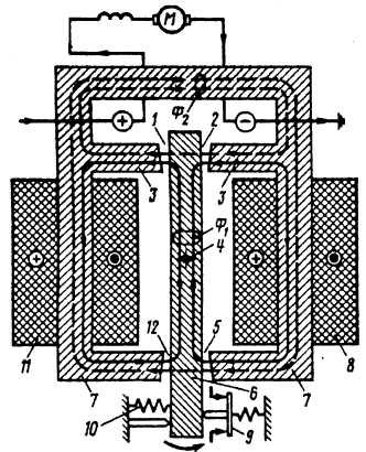 Реле имеет стальной трёх - стержневой наборный сердечник, на вертикальных сторонах которого находятся подмагничивающие катушки, включённые последовательно, а поэтому ток по ним протекает одинаковый. В верхнем окне магнитопровода помещаются входной и выходной силовые витки. При отсутствии короткого замыкания ток по входному и выходному виткам протекает одинаковый, и поэтому магнитные потоки направленные встречно, уничтожают друг друга; получается баланс магнитных потоков. В средней части магнитопровода помещается якорь, имеющий ось вращения. За счёт регулировочного винта и пружины якорь устанавливают так, чтобы его воздушные зазоры 3 и 4, 5 и 6 были одинаковыми.