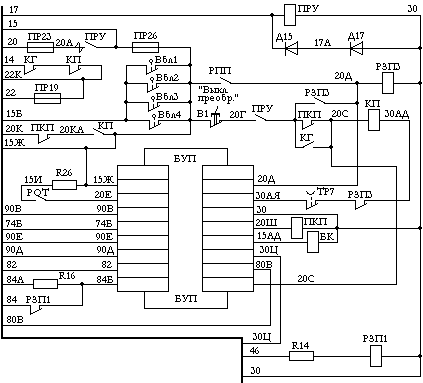1. После включения ВУ ПРУ получает питание по следующей цепи: провод 15→ плавкий предохранитель Пр54 → провод 22 → моторный вагон предохранитель Пр19 → провод 22П → прямая блокировка реле блокировок безопасности РББ1 (катушка реле РББ1 под питанием) → обратная блокировка реле безопасности блокировок РББ2 (провод 26 без питания, а следовательно и катушка реле РББ2) → провод 17 → прицепной вагон катушка промежуточного реле управления ПРУ → провод 30. Катушка ПРУ, получив питание, притягивает якорь и замыкает свой главный контакт, а также прямую блокировку в проводе 20Г-20В. В результате чего катушка контактора преобразователя КП получает питание.