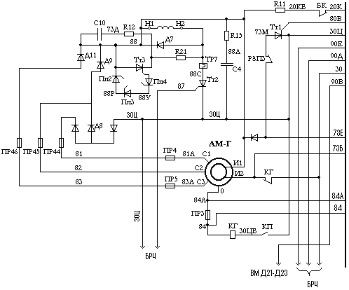 Цепь включения контактора: → провод 84А (нулевой провод синхронного генератора) → предохранитель Пр3 → провод 84 → катушка контактора КГ → провод 30ЦБ → прямая блокировка контактора КП → провод 30Ц → выпрямительный мост Д8-Д12 → провод 82Х (или 83Х) → предохранитель Пр44 (или Пр45) → провод 81 (или 82) → предохранитель Пр4 (в фазе С2 нет) → фаза синхронного генератора С1 (или С2).