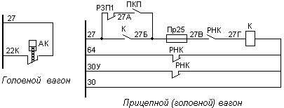 Управление мотор-компрессорами осуществляется по проводу 27 при включённом регуляторе давления АК на головном вагоне по цепи: → провод 22 → предохранитель ПР17 → провод 22К → регулятор давления АК → провод 27 → обратная блокировка реле защиты преобразователя РЗП1 → прямая блокировка контактора ПКП → предохранитель ПР25 → прямая блокировка реле напряжения компрессора РНК → катушка контактора К → провод 30.