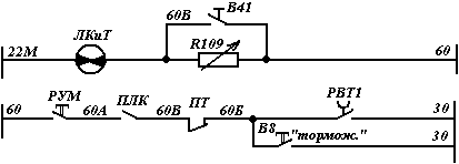 Блокировки повторителя тормозного переключателя ПТП-М и линейно-тормозного контактора ЛКТ обеспечивают питание линейного контактора ЛК на 2-20 позициях реостатного контроллера на этом сбор схемы в положении "М" заканчивается.