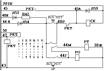 2. Затем переводим реверсивную рукоятку в положение "Вперед". В результате чего замыкаются контакторы реверсивного вала 2, 3 и 4, а контактор I размыкается. Теперь напряжение подается на провод 22В, а он на провод 42 по следующей цепи: → провод 15 → выключатель управления ВУ → предохранитель Пр54 → провод 22 (рис. № 28) → переключатель пневматического тормоза ППТ → провод 22Д (рис. №31) → кнопка "Возврат защиты" → контактор реверсивного валаконтроллера машиниста 3 → контактор главноговала контроллера машиниста 16 → провод 42 (рис. №67) → реле времени торможения РВТ1 → провод 30 (рис. №69).