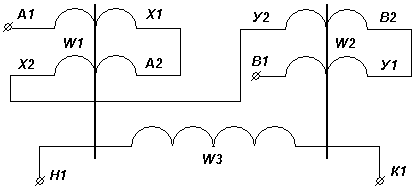 Магнитопровод усилителя выполнен из двух ленточных сердечников, материалом которых является электротехническая сталь. Усилитель имеет 4 рабочих обмотки. На одном сердечнике расположены обмотки А1-х1; А2-х2, а на другом В1-У1: В2-У2. Обмотка управления охватывает оба сердечника, корпусная изоляция - эпоксидный компаунд. В усилителе имеется окно, в котором пропущен один виток, являющийся обмоткой управления.