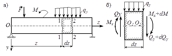 Выделим из балки бесконечно малый элемент (рис. 1.11,б) и рассмотрим его равновесие: