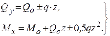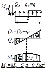 | 2. На участке с равномерно распределенной нагрузкой поперечная сила изменяется по линейному закону, а изгибающий момент описывается уравнением квадратной параболы, обращенной выпуклостью в сторону нагрузки. В сечении, где Qy = 0, Мх имеет экстремум. |