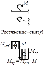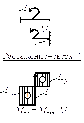 | 4. В сечении, где к балке приложен сосредоточенный момент М, на эпюре Мх возникает скачок, равный по величине приложенному моменту. Направление скачка зависит от направления момента: если момент вызывает растяжение нижних волокон, то скачок происходит вниз и наоборот. |