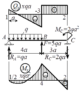 Находим момент в сечении В: MB = M max+ w Q = qa 2/2- - (1/2)3 qa ×3 a = -4 qa 2 и по трем точкам приближенно строим параболу, обращенную выпуклостью вниз. На участке ВС изгибающий момент изменяется по линейному закону от MB = -4 qa 2 до MC = MB + w Q = -4 qa 2 + 2 qa ×3 a = 2 qa 2. По условию загружения балки также имеем MC = 2 qa 2. Совпадение значений МС, найденных независимо друг от друга, свидетельствует о правильности построения эпюры Мх.