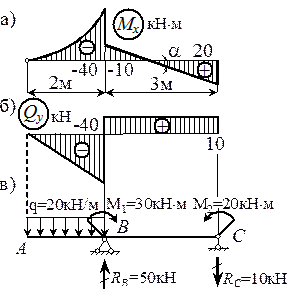 В сечении В изгибающий момент изменяется скачком от МВА = -40 кН×м до МВС = -10 кН×м, что свидетельствует о наличии пары сил М 1 = 30 кН×м, вызывающей растяжение нижних волокон (при обходе слева направо), т.е. направленной по часовой стрелке. На опоре С приложена пара сил с моментом М 2 = 20 кН×м, вызывающая растяжение снизу (при обходе справа налево), т.е. направленная против часовой стрелки.