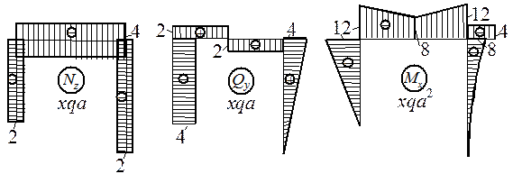 NCD = - VD = -2 qa. Ригель ВС сжимается силой НА, поэтому NDC = - HA = -4 qa. На консоли СЕ продольная сила отсутствует, т.е. NСЕ = 0.