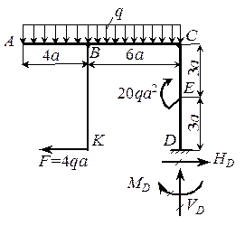 | П р и м е р 1.13 Для рамы, жестко защемленной одним концом, построить эпюры Nz, Qy и Mx. Р е ш е н и е. 1. Определение опорных реакций: å Xi = 0, HD = 4 qa; å Yi = 0, VD = q ×10 a = 10 qa; | Рис. 1.20 |