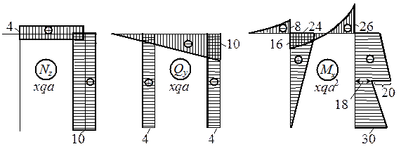 Э п ю р а Nz. Стойка CD сжимается силой NCD = - VD = -10 qa, а ригель ВС растягивается силой NBC = F = 4 qa. В остальных стержнях продольной силы нет.