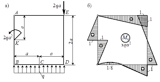 MCE = - MD - M + HD ×60 = -26 qa 2 и строим эпюру в стойке CD. В узле С нет внешней пары сил, поэтому MCB = MCE = -26 qa 2. В ригеле АС, нагруженном погонной нагрузкой q, изгибающий момент изменяется по квадратичному закону. В точке А нет внешней пары сил, поэтому МА = 0. Вычисляем