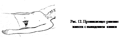 Открытые травмы живота ( проникающие и непроникающие). При проникающих ранениях возможны повреждения паренхиматозных органов, повреждения полых органов и сочетанные повреждения паренхиматозных и полых органов (рис. 12).