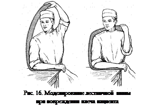 – вновь приложить шину от локтевого до плечевого сустава и на этом месте согнуть ее под тупым углом 115о, конец шины должен доходить до лопатки со здоровой стороны;