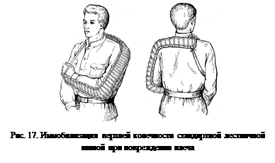 – вложить валик в ладонь, прибинтовать шину в области лучезапястного сустава восьмиобразной повязкой, в области локтевого сустава — черепицеобразной, в области плечевого сустава — колосовидной повязкой, либо зафиксировать шину повязкой Дезо.