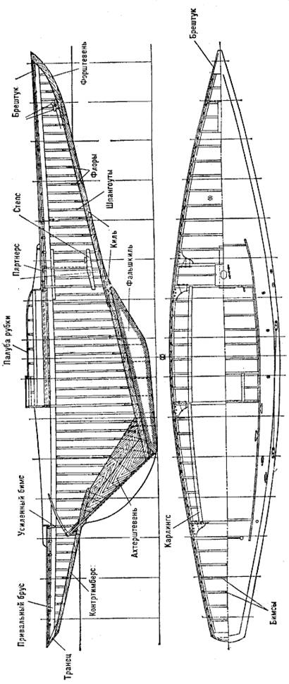Основной деталью набора является киль-брус, проходящий вдоль судна по его диаметральной плоскости (рис.). Киль представляет собой основную нижнюю продольную связь судна. Спереди к килю присоединяется форштевень -брус (или набор брусьев), определяющий форму носа или носового свеса. К кормовой части киля при помощи старнкницы крепится ахтерштевень - вертикальный брус, к которому у яхты с транцевой обрезной кормой крепится транец, а у яхты, имеющей кормовой свес (рис.), навешивается руль. Транец по кромкам усилен обвязкой - деревянной рамой, к которой крепятся концы обшивки и сам транец.