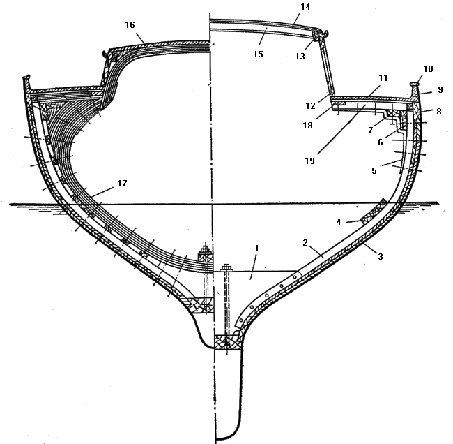| Рис. Поперечный разрез деревянной кругло-шпангоутной яхты: 1 — флор; 2 —шпангоут; 3 — двойная продольная обшивка; 4 — скуловой стрингер; 5 — висячая кница; 6 — привальный брус; 7— шельф; 8 — ширстрек; 9 — фальшборт; 10 — планширь; 11— палубный настил; 12 — комингс рубки; 13 — шельф; 14, 16 — крыша рубки; 15 — бимс; 17 — усиленный рамный шпангоут; 18 — карленгс; 19 — полубимс |